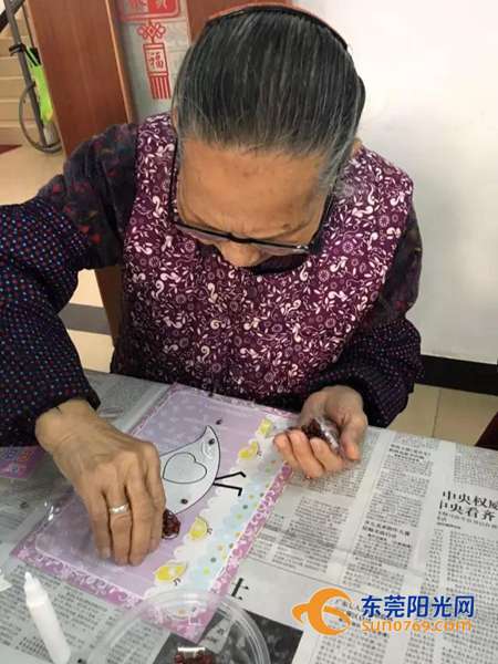 随后,社工分发“豆粘画”的材料给长者,指导长者一步步地制作。制作过程中,虽然豆子形状有点娇小,但是长者们都很有耐心地一颗一颗地粘上去,为自己的金鸡画增添豆子。转眼间,一幅幅的金鸡豆豆画就出现在社工的眼前了。其中一位婆婆分享了自己的创作心得:“做豆豆画需要很多细心与耐心,我完成了,好开心……”