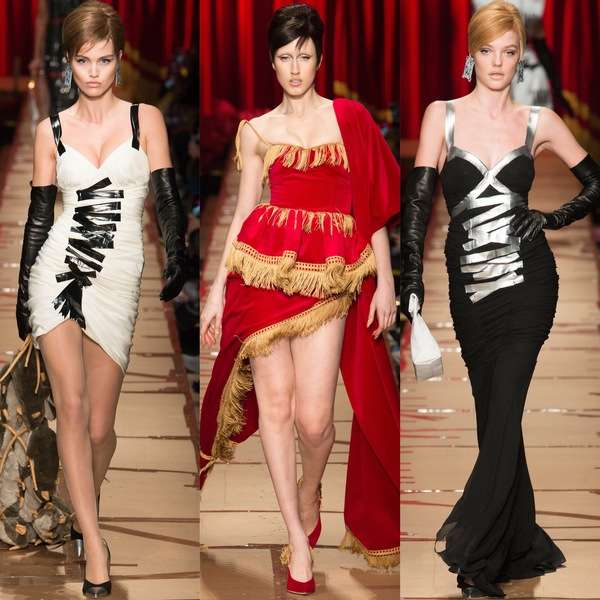 Jeremy Scott 的冷趣味在今季Moschino中发挥得更淋漓尽致。纸箱解构的造型不似过往同类型作品那样严肃,加上极富艺术感的标语,将模特们摇身一变成了画报上的摩登复古女郎,又多了一丝玩味气息。用废品做成时装,这类创意已经被滥用多次,但是“低俗垃圾”与“高级时装”共处一处的戏虐讽刺这还是头一个!