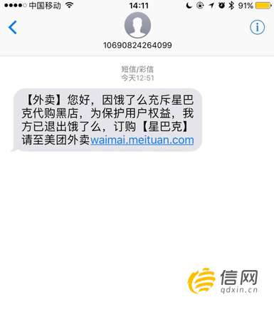 “因饿了么充斥星巴克代购黑店,为保护用户权益,我方已退出饿了么,订购星巴克请至美团外卖。”3月2日下午,一些注册过“饿了么”网上订餐平台的用户收到了这样一条短信,其中提到的“星巴克”、“代购黑店”、“退出饿了么”等字眼格外引人注目,不少用户怀疑之前在“饿了么”买到了假的星巴克。同时,也有人根据短信结尾处的“美团外卖”质疑这是一场为博人眼球的营销活动。信网(热线0532-80889431)了解到,星巴克的确没有推出外送服务,而一些第三方外卖平台上搜索到的星巴克外卖多为“代购”,青岛地区的星巴克“代购”则被一家名为“黑手-星巴克代购门店”的公司揽了下来。