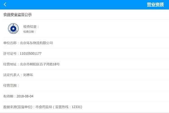 而查看该店的商家资质,显示该单位名称为北京环东物流有限公司,工商信息显示,该公司经营范围为:普通货物运输;货运代理;分批包装;仓储保管;经济信息咨询(不含中介服务)。并不涉及餐饮范围。而该店甚至在商家资质里上传了一张道路运输经营许可证。