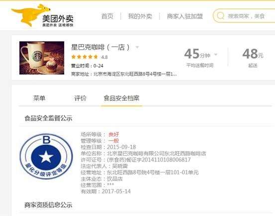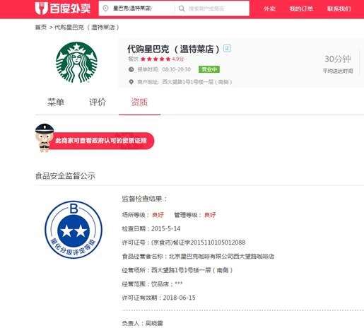 至此,三家外卖平台上的星巴克店的情况已大致清晰。饿了么上的星巴克店皆为代购,而且资质也存在疑问;美团外卖上的星巴克品牌店实际上也是代购,而且代购商家和百度外卖上的商家一样都存在着套用证照的现象。