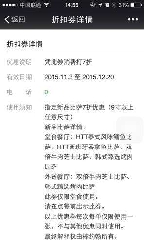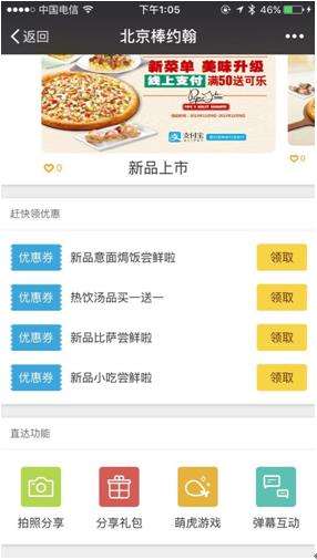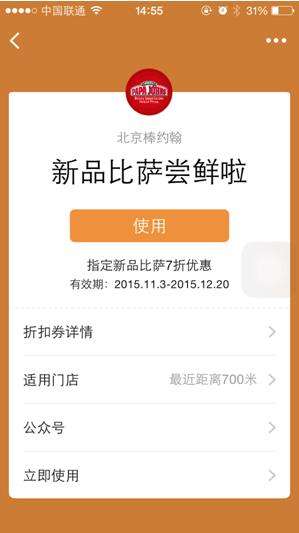 据介绍,此次棒约翰接入鲜老虎适逢菜品出新,因此棒约翰在卡券制作上主推新品折扣券,西班牙那吞鱼比萨,泰式风味鳕鱼比萨等新品比萨都可以享受到独有的折扣,再加上鲜老虎的分享礼包给好友功能,瞬间将棒约翰的新品折扣卡券发满朋友圈。