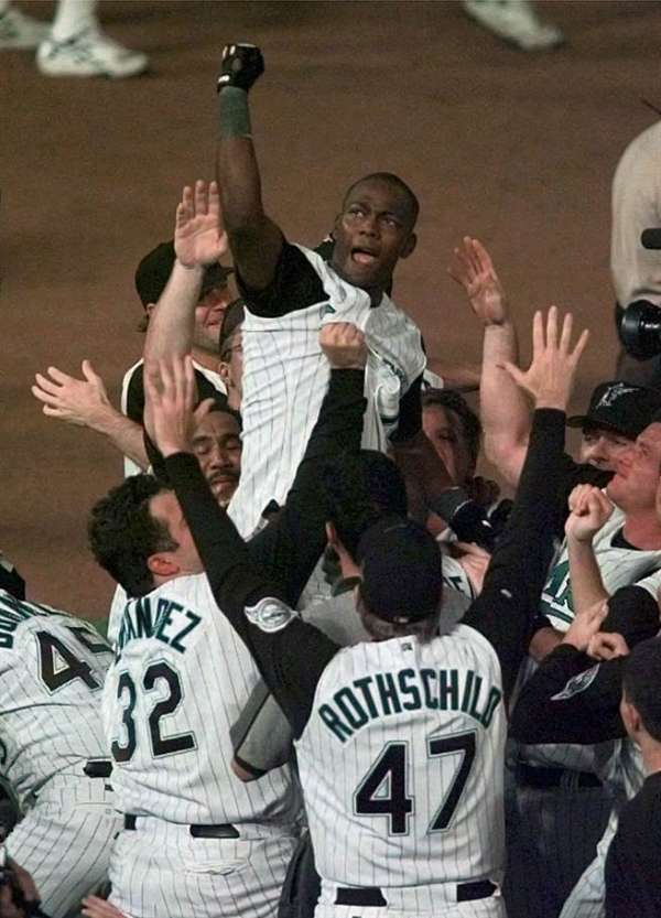 伦泰利亚(上)在1997年世界大赛第7战敲出再见安打,助马林鱼赢得队史首座世界大赛冠军。(美联社资料照)