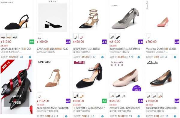 以天猫为例,只需要输入“高跟鞋”马上就弹出近25万的商品,价格从一百来块到上千元,款式更是应有尽有。