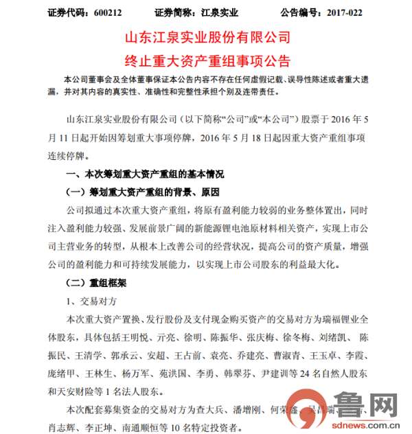 鲁网3月9日讯(记者 罗燕)刚刚“脱星摘帽”的山东江泉实业股份有限公司(江泉实业.600212.SH)今日发布公告,终止与山东瑞福锂业有限公司(瑞福锂业)的重组计划,这意味着,江泉实业耗时将近1年拟收购瑞福锂业的“大动作”宣告失败。