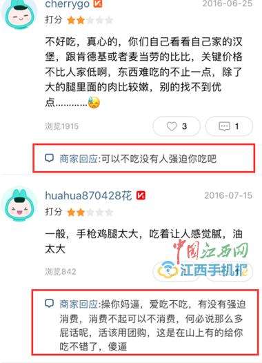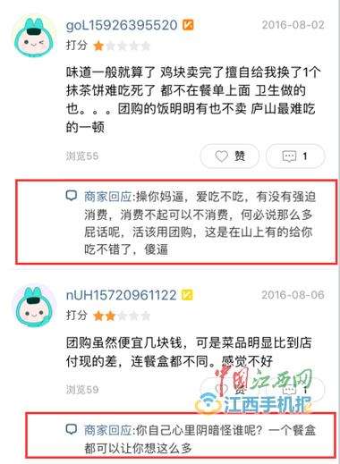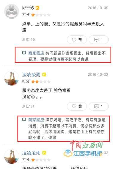 例如顾客说服务员态度特别差,商家回复:“X你妈X,爱吃不吃,有没有强迫消费,消费不起可以直说,活该用团购,这是在山上有的给你吃不错了,傻X。”言辞激烈。