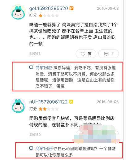 例如顾客说服务员态度特别差,商家回复:“X你妈X,爱吃不吃,有没有强迫消费,消费不起可以直说,活该用团购,这是在山上有的给你吃不错了,傻X。”言辞激烈。