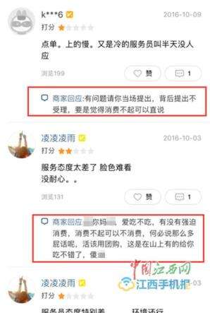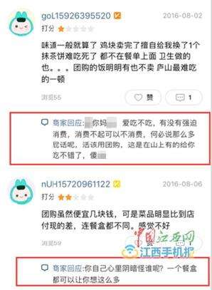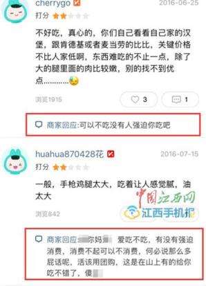 庐山风景区德克士餐厅爆粗口回应顾客差评 脏话连篇 时间:2017年02月06日 16:02:41\u00A0中财网 2月4日,有多名网友向中国江西网新闻热线0791-86849275爆料称,位于庐山市庐山风景区(牯岭街26号)的德克士餐厅商家因顾客反映其服务态度差、口感差等问题而对顾客恶语相向,话语粗暴,脏话连篇。 中国江西网记者2月4日在美团APP上找到该餐厅,在商家回复顾客的评论中,确有大量粗暴不堪的脏话:“X你妈X,爱吃不吃。”“消费不起可以不消费。”“有的给你吃不错了。”大量充斥在该店铺的评论中。 例如顾客说服务员态度特别差,商家回复:“X你妈X,爱吃不吃,有没有强迫消费,消费不起可以直说,活该用团购,这是在山上有的给你吃不错了,傻X。”言辞激烈。 有顾客评论说口味不怎么样,商家回复:“嘴巴这么叼,我们也是无语了。”还有顾客评论道食物中有头发,感觉恶心,商家回复:“很正常啊,会和员工强调注意一下。” 商家:仍正常营业电话无法接通 2月4日,中国江西网记者按照美团上提示的电话致电该商家,语音提示电话有误,无法接通。 翻开用户评论,最新一条显示的时间为2017年2月3日。此外,在2016年12月与2017年1月,商家都与消费者有过相关互动评论。 据春节期间去庐山旅游的网友回馈,该餐厅仍在正常营业中。 德克士庐山店怒怼顾客,用语粗暴不堪,涉及人身攻击。 美团方:如属实将会对商家作出处罚 针对此事,2月4日,中国江西网记者致电美团网官方客服,“真实评价是顾客在体验完商家的服务之后内心的感受,是消费者维护自己权益的一种方式。我们(美团网)是禁止商家对顾客进行辱骂这种行为的。” 对于此类商家,美团会做出怎样的处理?该客户人员表示,美团网会根据消费者的投诉,对其商铺进行情况核实,如果属实,将会督促商家进行改进,并作出一定金额的处罚。 客服称,美团网的相关部门也会对其上线商铺进行定期考核,包括卫生状况、服务态度、口味等进行一个综合的评价,“如果考核不过关,美团网将会考虑取消合作。” 客服人员告诉中国江西网记者,遇到服务差、态度恶劣、对顾客进行人身攻击的商家,消费者可采取以下两种方式来维护自己的权益:在美团APP上投诉商家,消费者可进入用户中心将自己的真实遭遇反映到页面中,或拨打官方客服电话10107888进行投诉,客服人员也可协助消费者反馈情况。 .澎.湃.新.闻