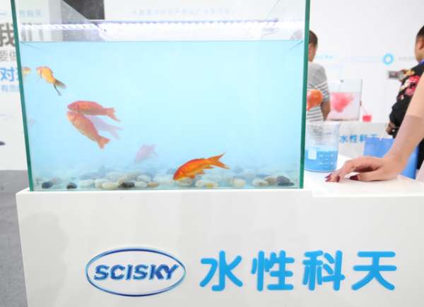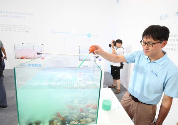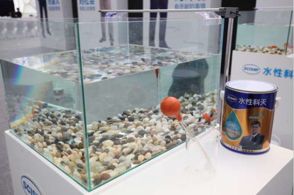 在水性科天品牌发布会现场布置了十几个装有数条金鱼的透明玻璃鱼缸,展台上同时摆放有滴管、水性涂料供参观人员试验。不少参展人员在试验之前还有些不忍下手,对水性涂料的安全性还抱有顾虑,然而当亲眼看到清澈的水被涂料染得五颜六色,金鱼依旧欢快的游来游去时,都对水性涂料的安全性予以了肯定。