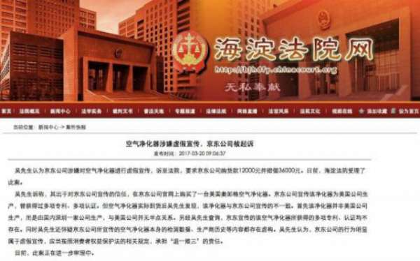 据海淀法院官网3月20日消息,空气净化器涉嫌虚假宣传,京东公司被起诉。这位吴姓消费者要求京东公司购货款12000元并赔偿36000元。日前,海淀法院受理了此案。