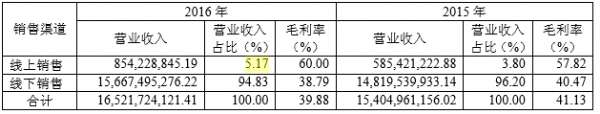 但2016年财报显示,海澜之家的销售渠道分为线上销售与线下销售,其中线上销售的营业收入为8.54亿元,占比为5.17%,线下收入的占比为94.83%。