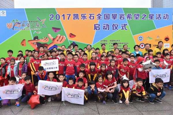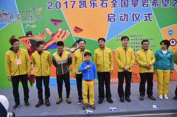 2017年3月25日,2017年凯乐石全国攀岩希望之星活动暨广州站邀请赛欢乐启幕,启动仪式在广州天河体育中心举办,国际攀联副主席、中国登山协会主席李致新及广东省体育局局长王禹平、广州市体育局局长罗京军等一众领导出席了启动仪式。(图1,登协领导在启动仪式上,后排左五为李致新)另外,2015年度国际攀联世界杯总冠军钟齐鑫作为特邀嘉宾也出席了该仪式。150名来自全国各地的攀岩小选手们见证了全年活动大幕的开启,并参加了广州站的交流比赛。本次参赛有获得去年攀岩希望之星称号的高维岳,有不远千里从银川、上海、长沙等地赶赴赛场的选手,也有大力推动攀岩运动发展的中山菊城小学等珠三角周边攀岩希望之星承办单位积极参与,在广州市户外节的大力推动下,作为全年系列活动的开端,启动仪式别开生面,引人入胜。