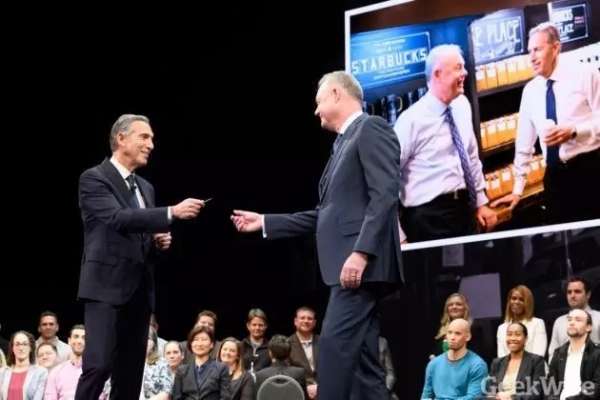 ▲ 舒尔茨将“星巴克之匙”交给下任 CEO 约翰逊,图片来自:GeekWire