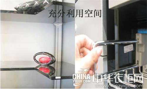 除了间隔可调外,还有一些小细节上的设计,可以为你节省更多的空间,把所有的资源都充分利用起来。比如柜壁的领带抽,不用的时候就藏在里面,贴着柜壁,几乎不占空间。转角处位置也是消费者一般比较头疼的,这款衣帽间特别配备转角设计的搁板,解决了消费者的困扰。