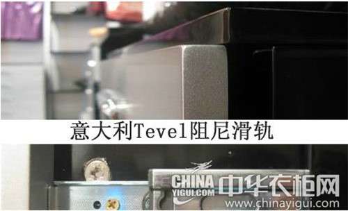 这款衣帽间的抽屉滑轨全部选用意大利Tevel阻尼路轨,用壁厚1.2—1.5mm的碳钢制作,搜房家居测评专员用力地甩上抽屉时,发现柜口快与柜体撞上时,渐渐慢了下了,后慢慢密合,没有发出噪音。店员介绍,这种滑轨正常使用寿命在十年以上。