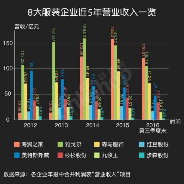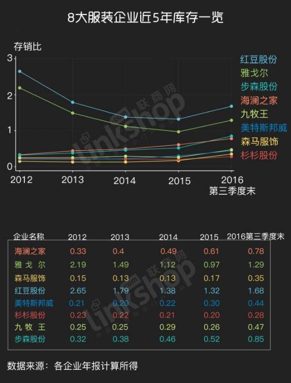 《联商网》监测了包括海澜之家、雅戈尔、美邦服饰(美特斯邦威)在内的8家服装企业近5年(含2016年1-9月数据)的库存、销售及存销比情况。