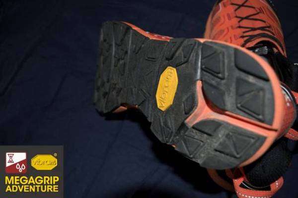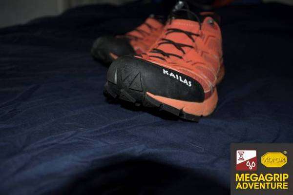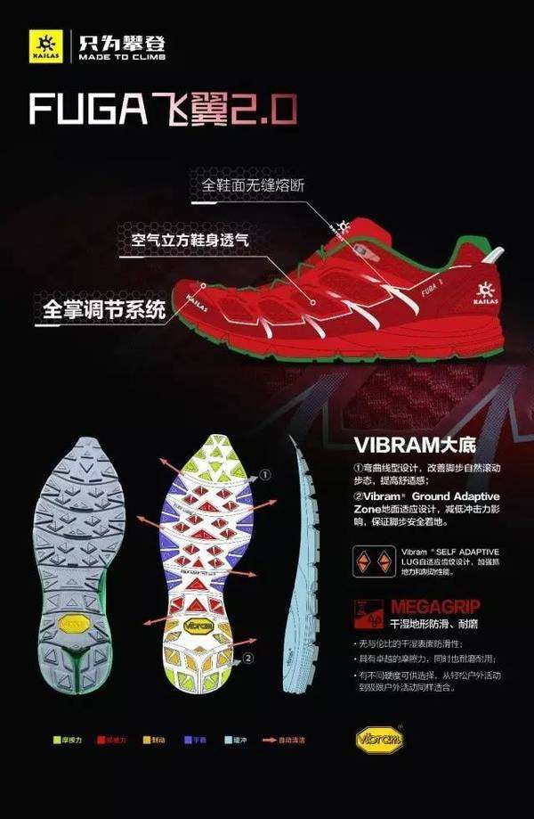 KAILAS FUGA Ⅱ采用的是Vibram最新的橡胶配方 Megagrip鞋底。Megagrip的目的是解决Vibram鞋底在湿滑表面上的通过性这一问题。经过上百次配方试验和测试,Vibram Megagrip橡胶配方解决了必需湿滑表面摩擦力的户外活动难题,正在成为越野跑鞋鞋底的新一代标准配置。