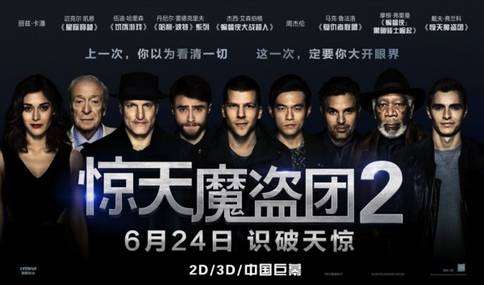 《魔盗团2》曝光终极预告 幕后大BOSS成悬念 由狮门影业和电广传媒影业重金打造,狮鼠影业协助推广,美籍华裔导演朱浩伟执导,杰西·艾森伯格、伍迪·哈里森、戴夫·弗兰科、丽兹·卡潘、“绿巨人”马克·鲁法洛、迈克尔·凯恩、摩根·弗里曼联合周杰伦、“哈利·波特”丹尼尔·雷德克里夫主演的高智商犯罪动作巨制《惊天魔盗团2》已定档于6月24日在内地上映 2016-06-15 09:15:37