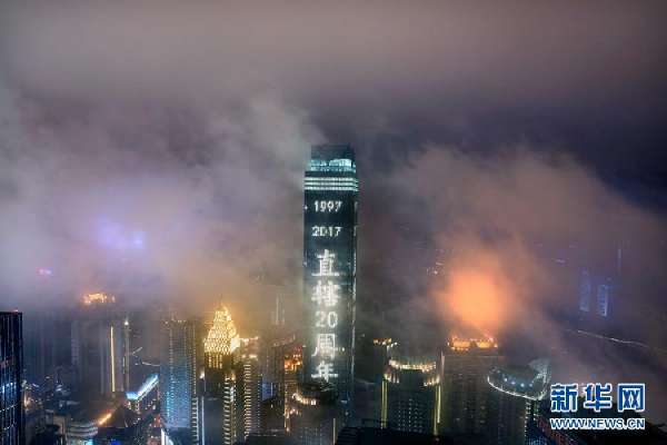 2017年是重庆市直辖20周年,位于重庆母城渝中区的解放碑商圈点亮大屏幕,显示出“直辖20周年”几个大字。