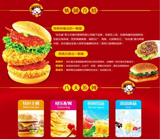 快乐星汉堡自2002年第一家门店开业以来,以令人震惊的速度飞速发展。于短短十五年的时间里,从一做起,如今快乐星汉堡已经成为本土西式快餐连锁加盟的一流品牌,门店数量已达近4000家,足迹可谓是遍布大江南北。快乐星汉堡不仅是ISO9001质量管理体系的权威认证企业,商务部备案资料完善,全国质量、服务、诚信的AAA级企业,还是世博会民营企业馆唯一一家西式快餐展出企业。快乐星汉堡的优秀有目共睹,也是广大加盟商值得信赖的好品牌。