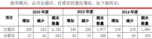 由此可见,周大生的终端门店以加盟店为主,占比高达88%。据招股书披露,报告期内,公司自营店数量有所减少,从 2014 年末的 339 家减少至2016年末的294家,而加盟店数量逐步增加,从 2014年末的1,860家增加至 2016年末的2,162家,增幅达16.24%(表一)。