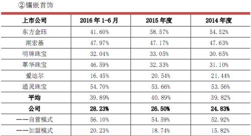 此外,周大生的毛利率构成也令人费解,报告期内,公司主营业务毛利率为 29.71%、30.69%及 32.84%,有所增长并维持在较高水平。分产品看,素金类相关产品毛利率水平与同行业上市公司相比较高。周大生解释称这是由于公司主要采取自营模式销售素金类产品。相反,公司镶嵌首饰类毛利率与同行业上市公司相比较低,这是由于公司主要通过加盟方式进行镶嵌饰品销售的销售。