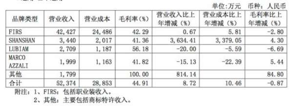 杉杉品牌主营男士商务正装及商务休闲装的设计、推广及分销,产品类别包括西服、裤 子、衬衫、休闲服及其他(包括T恤、毛衫、绵羽产品、夹克、皮衣和配饰)。目前,旗下有包括FIRS、SHANSHAN、MARCO AZZALI和LUBIAM4个品牌。其中,FIRS品牌对销售贡献最大,期内贡献了4.24亿元,占服装总销售80.92%;而SHANSHAN品牌的营收同比增长3634.41%。