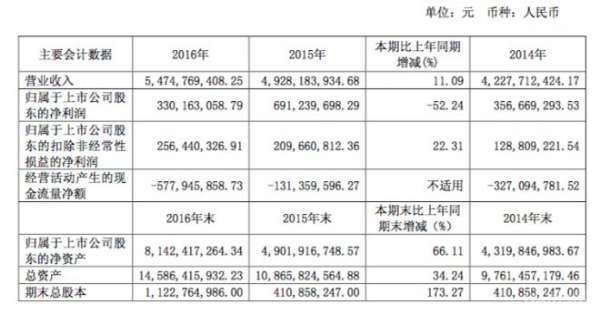 4月17日晚间,宁波杉杉股份有限公司(以下简称“杉杉股份”,公司代码:600884)公布了其2016年年度报告。期内实现营收54.75亿元,同比增长11.09%;实现归属于上市公司股东的净利润3.30亿元,同比减少52.24%,主要系2015年减持宁波银行部分股票获得投资收益较高所致。