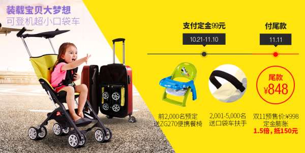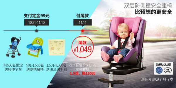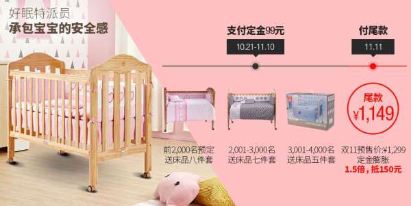相比于以往“双11”熬夜蹲点秒杀而言,今年“双11”好孩子天猫预购活动则推出了“先预定,后付款”的购物方式。消费者可提前关注所需商品,将其放入购物车中,然后再支付定金即可。而到了“双11”当天,消费者提前预交的定金则可翻1.5-2倍使用,还可享受“双11”优先发货的权利。此外,抢付定金的消费者,还可获得高值赠品。