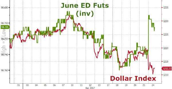 此外,欧洲美元(Eurodollar)2个月期货合约(下图绿线)的走势升高,代表市场预期6月时的利率不会升高,也同CME“美联储观察工具”中的市场预期相互矛盾。