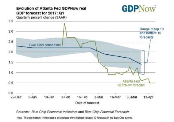 本周五将公布美国的一季度GDP初读,市场结合近期“软性数据”利好和“硬性数据”不佳的趋势,认为一季度GDP增速或不及预期。一向被认为同官方数据更为贴近的亚特兰大联储“GDPNow”模型预计,美国今年一季度的GDP增速仅为0.5%。