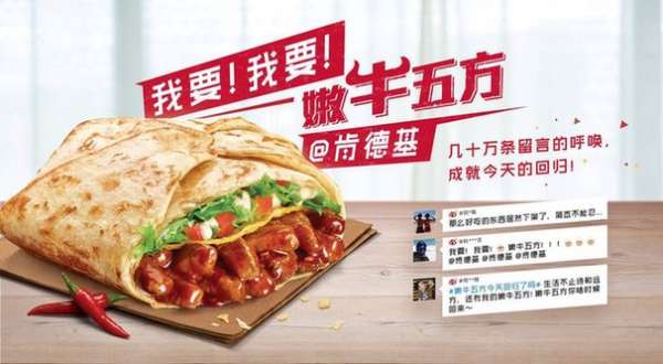 2008年至今,几十万条呼唤川辣嫩牛五方回归的社交媒体留言,证明了它的超高人气。更有粉丝发起#嫩牛五方今天回归了吗#的微博话题,呼吁川辣嫩牛五方回归。尽管已下线多年,很多铁杆粉丝扔对它念念不忘、时刻表白:“我对它的爱不亚于你们对爱豆的爱”、“不用诗和远方,我只要我的嫩牛五方”……所谓念念不忘,必有回响,为了和热爱肯德基的消费者一起回味肯德基中国的30年,品牌将响应消费者呼声,再次隆重推出川辣嫩牛五方,以9年前的价格,带回浓浓的肯德基情怀。