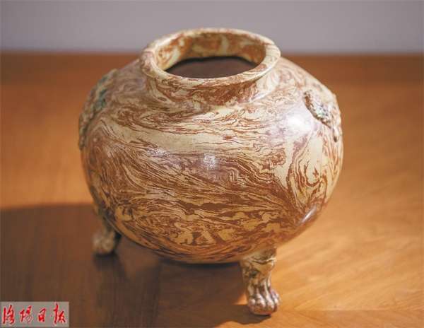 绞胎三彩是我国唐代陶瓷装饰工艺中的特殊工艺,它用白、褐两色泥料经手工揉搓成胎,焙烧后的器物经窑变自然呈现奇妙无比的纹饰图案。据记载,以唐代河洛地区巩县裴家绞胎窑技艺最为精湛,到了宋代后,由于工艺难度大、烧制火候难掌握等原因,该技艺渐至失传。