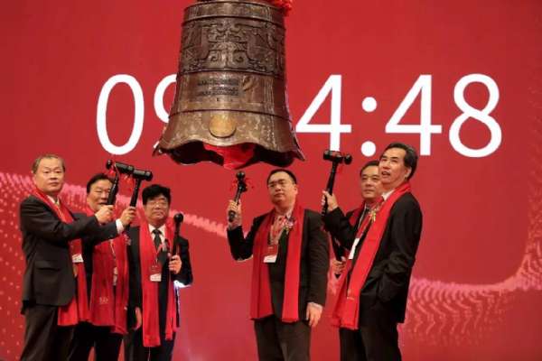 ▲周宗文董事长、周飞鸣董事副总经理、贺海涛区委书记、姜明会长、巫开立会长、庄礼祥会长等6位嘉宾参与了周大生上市敲钟仪式