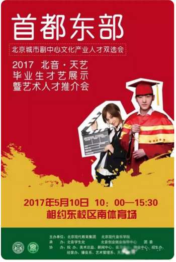 \u00A0 \u00A02017北音.天艺毕业生才艺展示暨艺术人才推介会5月10日将隆重举行。今年,我们面向全社会开放,辐射京津冀,为促进新北京(通州区)文化艺术功能区发展,打造通州九棵树区域音乐产业全国中心地位,为北京城市副中心文化、艺术、艺教人才输出创建绿色通道。 \u00A0