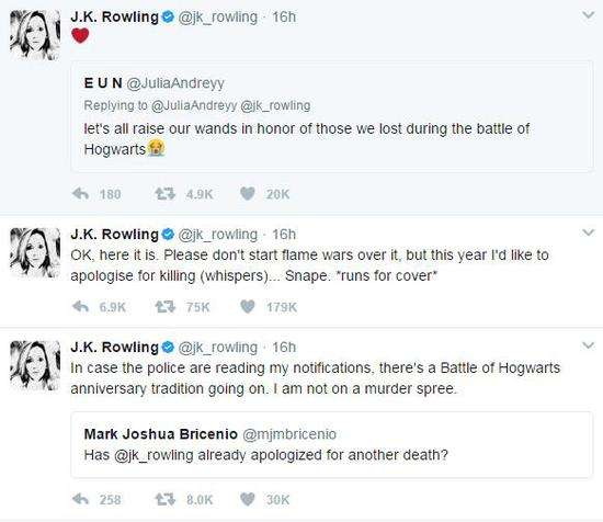 她先是转发一位网友的疑问“J·K·罗琳今年有向死者道歉吗?”,幽默回应“以防万一有警察在看,我先说清楚这是纪念霍格沃茨之战的传统,我不是杀人狂。”然后她再发一条推:“今年我为杀死了(小声说)……斯内普而道歉”。