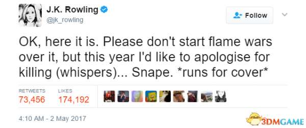 “好吧,这就开始。我不想引战,不过今年我想为(小声说)。。。斯内普的死而道歉。 *马上躲起来*”