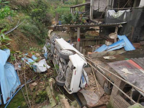 当天下午,女司机李某驾驶着刚买不久的丰田牌小型轿车,从西坪镇区往芦田方向行驶。行至西坪镇观音路段时,她发现走了岔路,于是就直接在弯道路中间将车辆调头。正好此时,对面驶来了一辆中型货车,李某一时慌乱,正准备踩下刹车,由于位置把握不准,结果直接踩在了油门踏板上,导致车辆直接冲出公路,并从路边地势较低的一处平房顶上驶过,直接撞毁了一处农家猪圈。所幸猪圈旁都是红土,土质松软,车辆撞上以后缓冲了一下,且平房附近无人员经过,现场只有李某一人受了轻微皮外伤。