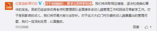 对此,微博认证为北京红黄蓝儿童教育科技发展有限公司的@红黄蓝教育机构在今日回复称,对于该园园长,要求立即停职检查。我们将采取相应措施,坚决杜绝类似事件的发生。目前已经安排优秀老师和管理团队全面接手该幼儿园管理工作和班级日常教学工作。对于受到影响的幼儿,我们将尽最大努力去弥补。对于此次大红门村办委托幼儿园暴露出的管理问题,我们一定深刻反思,认真整改。