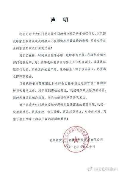 4月20日下午,红黄蓝教育机构新浪官方微博做出了回应。回应中称,对于大红门幼儿园个别教师出现的严重错误行为,以及因此给家长和幼儿造成的极大不良影响表示歉意。他们将在第一时间成立应急小组,跟踪事态发展,积极配合相关部门彻查此事。对于涉事老师要求立即停止工作配合调查,涉及违法犯罪行为的,坚决支持依法严惩,绝不姑息!对于该园园长,已要求立即停职检查。
