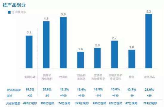 这家公司近年来正在加大医疗、营养品、健康领域的投入。不过目前营养品和健康科学部门目前占雀巢总收入的16.7%,有机增长(指不考虑汇率变化,收购和剥离业务的净增长)为2%。值得注意的是,和它的竞争对手玛氏类似,雀巢的宠物业务也增长迅猛。