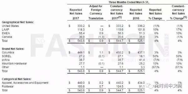 无时尚中文网(微信号:nofashioncn)2017年4月28日报道:美国户外体育用品制造商Columbia Sportswear Co. (NASDAQ:COLM) 哥伦比亚运动服装公司周四发布一季度财报,截止3月底一季度该波特兰户外运动品牌公司每股收益录得0.51美元,较2016年同期0.45美元有13.3%的涨幅,远超Zacks 预期的0.41美元;5.438亿美元的季度收入同比有3.6%的增幅,同样超越Zacks预期的5.358亿美元。