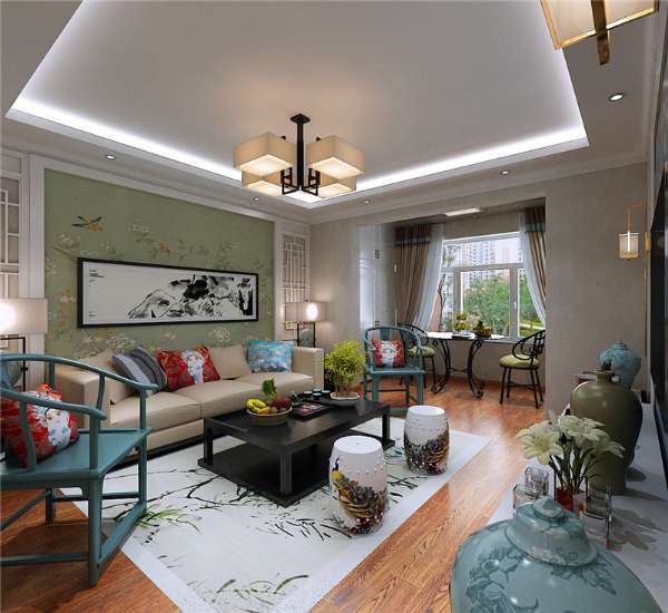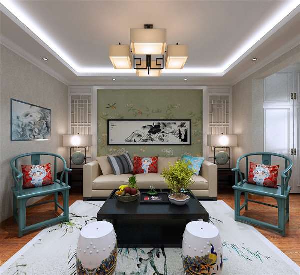 客厅,简单的吊顶造型,颜色的搭配,白色、红色、绿色、青绿色等的组合方式看起来使整个客厅更有活力。