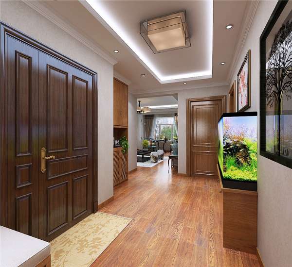 玄关,除了满足日常的鞋子等物品收纳功能外,此处还做了一个鱼缸,值得注意的是风水上说开门最好不要正对着鱼缸,偏一下大门会更好,因为担心会不聚财~