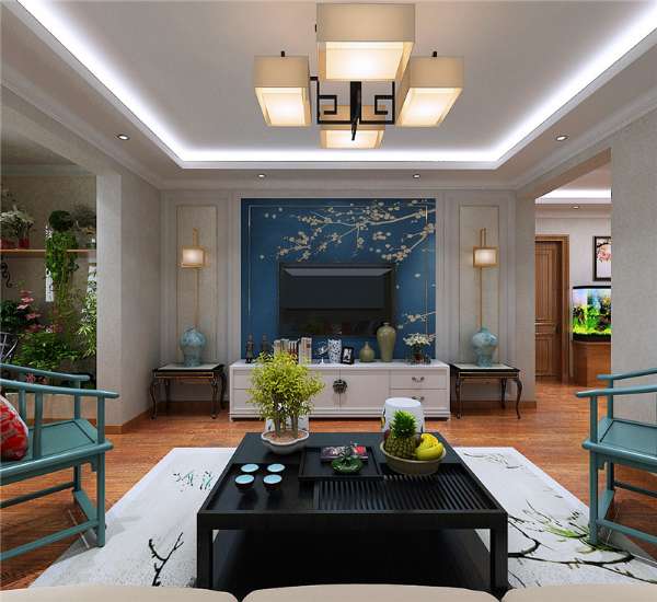 电视背景墙,同样也是用了对称的手法,而且与沙发背景墙相呼应,它的中间则贴的蓝色的梅花壁纸,搭配白色的电视墙,整体看起来既现代又时尚又有中式的韵味~