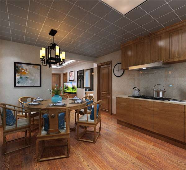 开放式的厨房,吊顶与餐厅做成一个整体,统一做成了集成吊顶~
