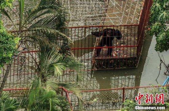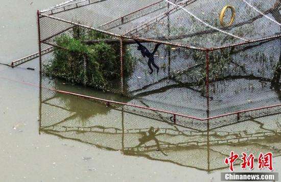 动物园里的一只黑猩猩被洪水困在笼中一角。