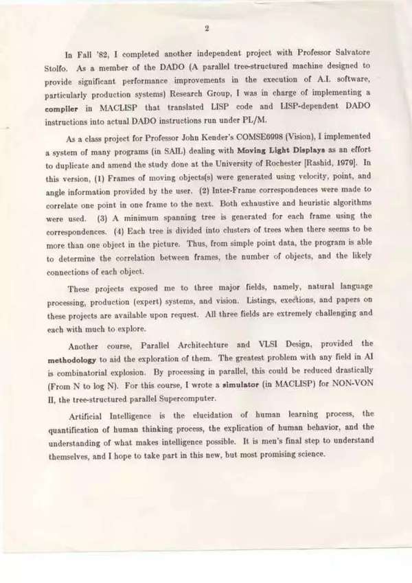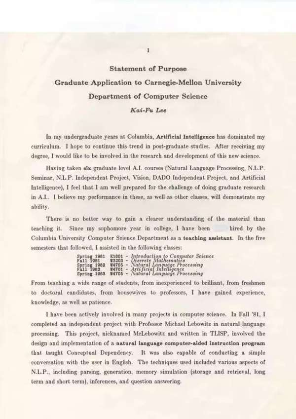 李开复博士申请博士时的个人陈述信,他在给教授的信中写道:人工智能是对人类学习过程的阐释,人类思维过程的量化,人类行为的澄清,以及对人的智力的理解。