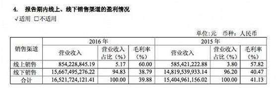 2016年财报显示,海澜之家的销售渠道分为线上销售与线下销售,其中线上销售的营业收入为8.54亿元,占比为5.17%,线下收入的占比为94.83%,不难看出,线上销售占比并不大,线下销售的模式才是海澜之家服饰销售的主要模式。