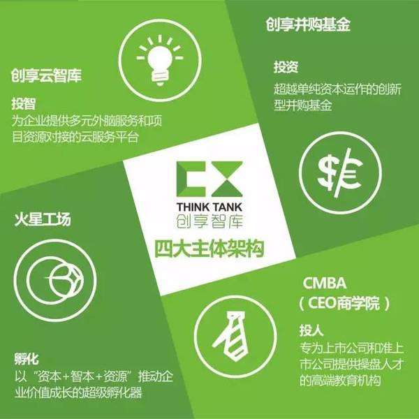 创享智库主体架构包括一个云智库中国民营企业外脑服务平台,一支并购基金、一家创新型孵化器、一所全球CMBA(企业CEO商学院),为企业提供从战略定位、商业模式优化到股权改造、资本运营的系统解决方案。